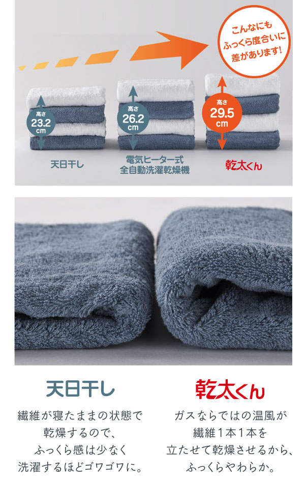 電気式乾燥機と比べ、ガスの強力な温風で一気に乾燥。