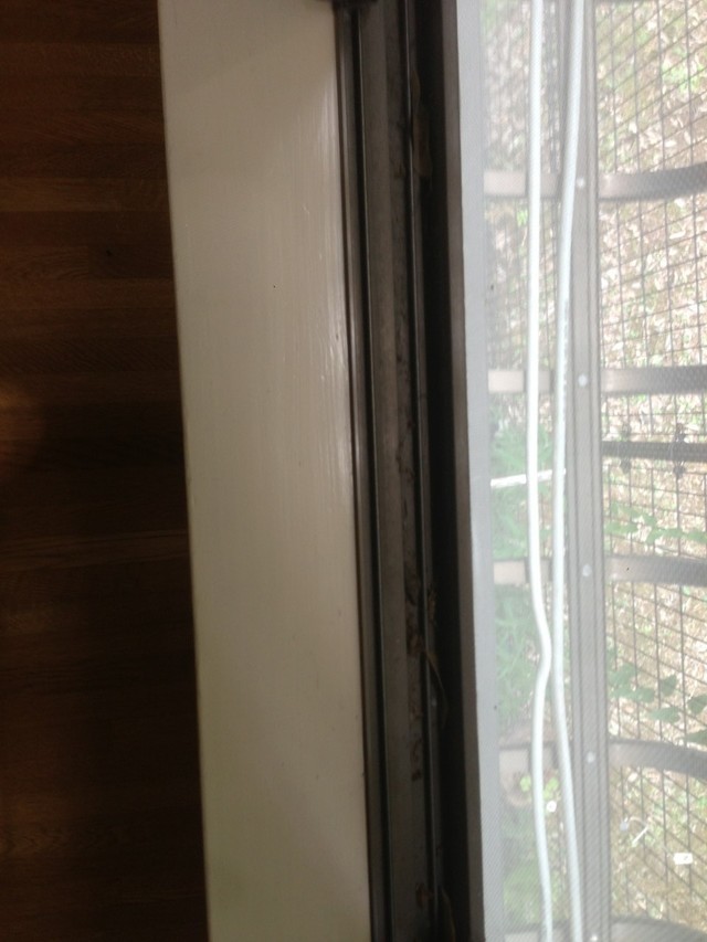 サッシの溝部分に固まった埃汚れが溜まっておりました。