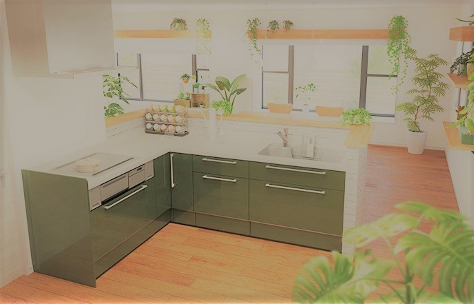 緑をたくさん取り入れたキッチンのショールーム