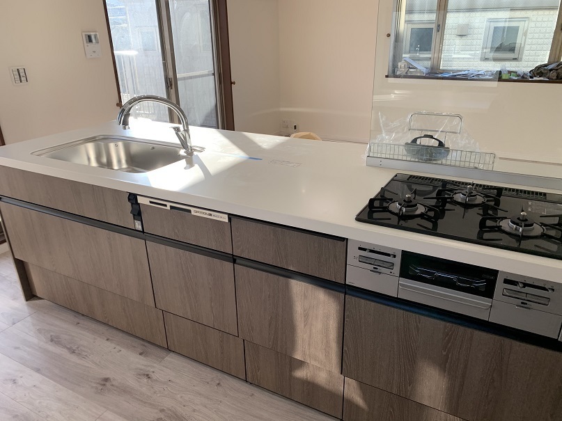水栓金具はLIXIL製のハンズフリー水栓(JFNA412SJG5)になり、ガスコンロはリンナイ製で3口コンロ・ガラストップタイプ(R3634COW1V132A)になります。