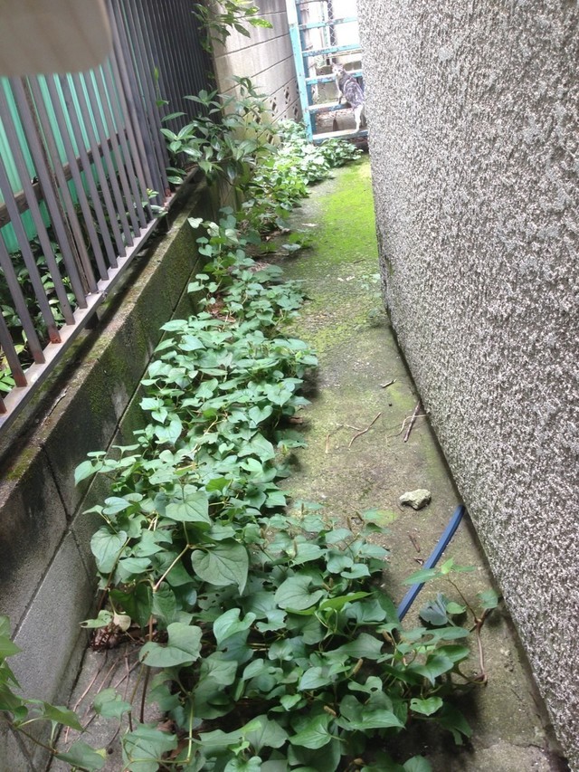 草刈り⇒除草剤撒き⇒防草シート⇒砂利敷き⇒外部清掃を行いました。